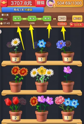 3、持续按这样的节奏操作,直到所有花盆里的花都顺利合成花束,这一关就算过关了!每完成一关,游戏还会为你准备一个红包奖励,简直超值。