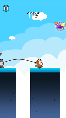 2、保持长按,角色将跃向理想的高台采集各种分数,尽量避免掉落,过的平台越多,收获也越丰厚。