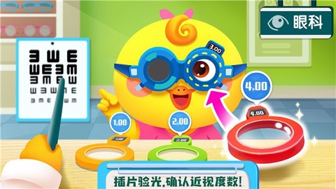 3、在眼科检查环节,用户将帮助小鸡进行视力检查,学习散瞳验光和配镜知识,增强孩子们的健康意识,预防近视。